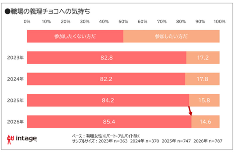 また、減少傾向が続く「義理チョコ」について、有職女性に職場の義理チョコへの参加について質問。「参加したくない方だ」と答えた人は、昨年より1.2ポイント増え85.4%。2022年に調査を開始して以来の最高値を更新した。