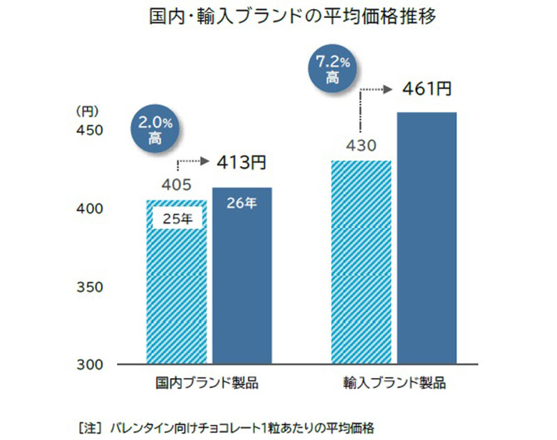 国内(日本)ブランドは前年から8円・2.0%アップの413円、ハイブランドが多いフランス産やベルギー産など輸入ブランドでは31円・7.2%アップの461円。いずれも、2022年以降で最高値を更新。