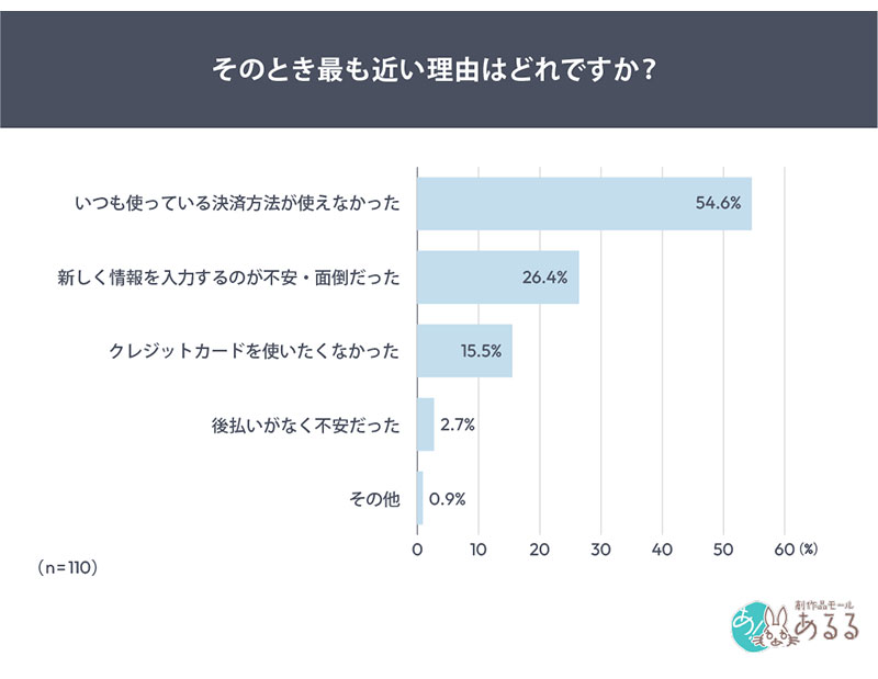 購入を断念した経験がある人に、その理由を質問。「いつも使っている決済方法が使えなかった」が54.6%と半数以上を占めた。