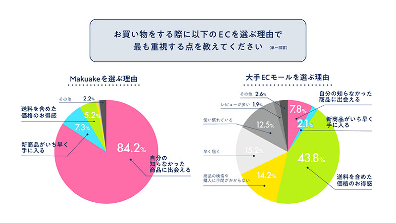 「買い物をする際に『Makuake』か『大手ECモール』を選ぶ理由で最も重視する点」について質問。「大手ECモール」では「送料を含めた価格のお得感」が、43.8%で最も多かった。一方、「Makuake」では「自分の知らなかった商品に出会える」が84.2%を占めた。