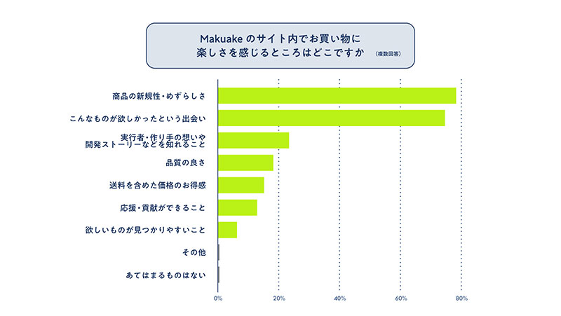 「Makuakeのサイト内で、お買い物に楽しさを感じるところはどこですか」という質問に対しては、「商品の新規性・めずらしさ」が78.3%で最多に。続いて「こんなものが欲しかった、という出会い」が74.6%と、大多数を占めた。
