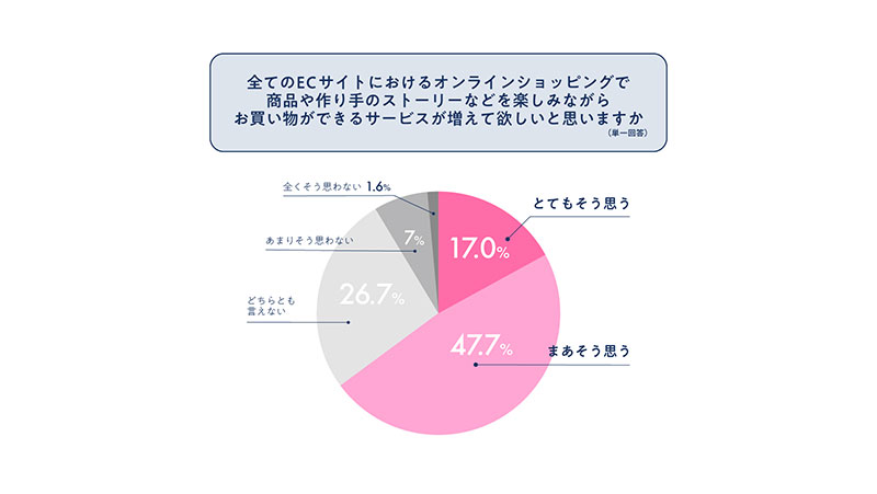 さらに「全てのECサイトにおけるオンラインショッピングで、商品や作り手のストーリー等を楽しみながらお買い物ができるサービスが増えて欲しいと思いますか」質問。「とてもそう思う」「まあそう思う」が合わせて、64.7%という結果になった。