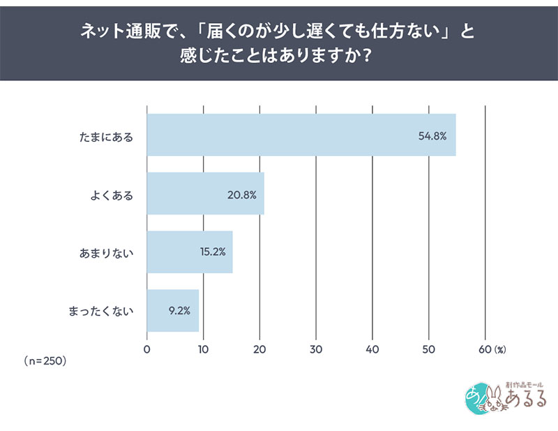 本調査では「届くのが少し遅くても仕方ないと感じたことがあるか」を質問。その結果「よくある」が20.8%、「たまにある」が54.8%と合計すると75.6%が「遅さを許容した経験がある」と回答した。