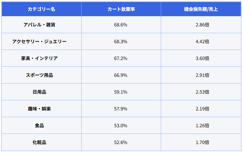 「アパレル・雑貨」や「アクセサリー・ジュエリー」は、カゴ落ち率が7割近くに達している。