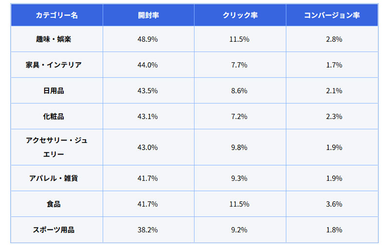 各カテゴリーの中でも「CART RECOVERY®」の契約が多い8カテゴリーの効果を確認したところ、「趣味・娯楽」は開封率が約49%と最も高く、ユーザーの熱量の高さがうかがえる。