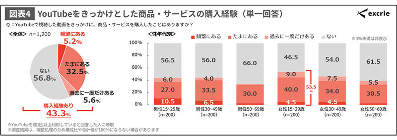 YouTube動画をきっかけとした商品・サービスの購入経験は、全体の43.3%が「購入したことがある」と回答した。