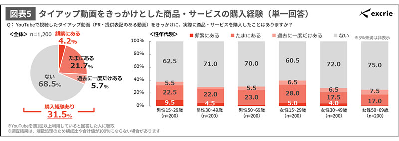 YouTubeに投稿された「タイアップ動画(案件)」をきっかけとした商品・サービスの購入経験は、全体の31.5%が「購入したことがある」と回答。特に、男女15~29歳の、購入経験率が高いことが明らかとなった。