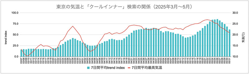 春の類似年である2025年の3~5月にかけて、春夏商品のGoogle検索数と東京の気温の傾向では「クールインナー」の検索数は3月下旬の気温上昇に伴い増加。その後、4月中旬頃から気温が上がるにつれて、検索数も緩やかに増えている。また、この期間の検索数のピークは5月下旬で気温のピークと一致している。