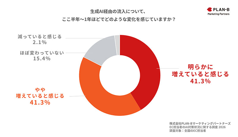 前問でAI経由の流入を「数値を含めて把握している」または「流入の有無は把握している(数値までは見ていない)」と回答した人を対象に、ここ半年〜1年ほどでの流入数の変化について質問。「明らかに増えていると感じる」41.3%、「やや増えていると感じる」41.3%を合わせて、82.6%が「増えている」と回答した。