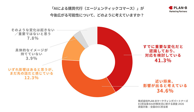 続いて「AIによる購買代行(エージェンティックコマース)」の広がりに対する意識について質問。「すでに重要な変化だと認識しており、対応を検討している」41.3%と「近い将来、影響が出ると考えている」34.6%を合わせて、75.9%が将来的な重要性を認識していることが分かった。