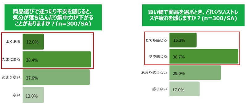 また、50.4%が買い物で迷いや不安を感じると「気分が落ち込む・集中力が低下する」と回答。さらに、54.0%が「買い物時にストレスや疲れを感じる」と答えており、買い物の「心理的負担」が、メンタルに影響を与えている可能性が示唆された。