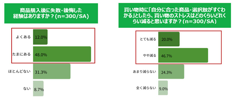 商品購入後に「失敗や後悔を感じたことがある」と回答した人は60.0%を占めた。また、66.7%が「自分に合った商品・選択肢がすぐわかればストレスは減る」と回答しており「正解がわからない不安」がストレスにつながっている可能性がうかがえる。