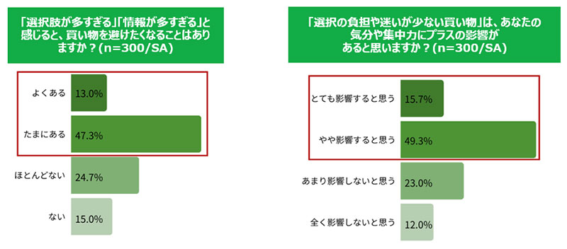 さらに、60.3%が「選択肢や情報が多すぎると買い物を避けたくなる」と回答。また、65.0%が「選択の負担が少ない買い物は、気分や集中力にプラスの影響があると思う」と答えており、買い物における「心理的負担」を軽減することのニーズの高さが浮き彫りになった。