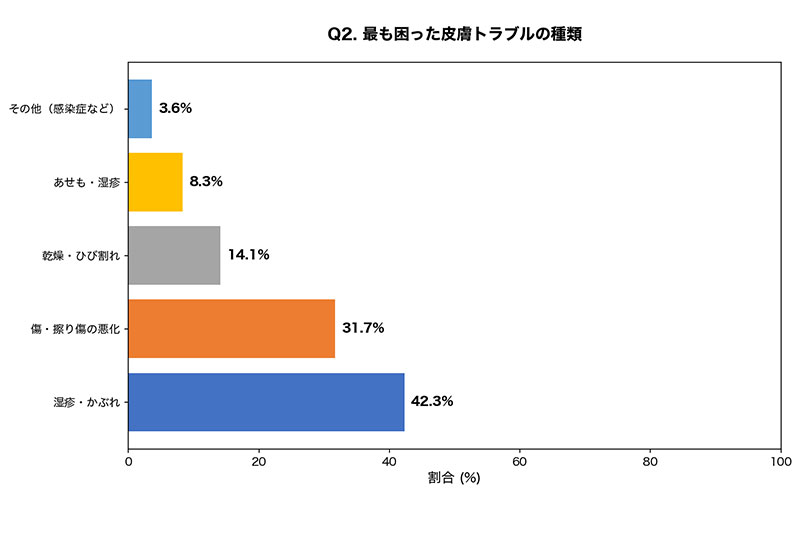 続いて、「避難生活中に経験した皮膚トラブルの種類として、最も困ったものは何ですか?(皮膚トラブル経験者のみ回答)」と質問。「湿疹・かぶれ」が42.3%で最多となった。