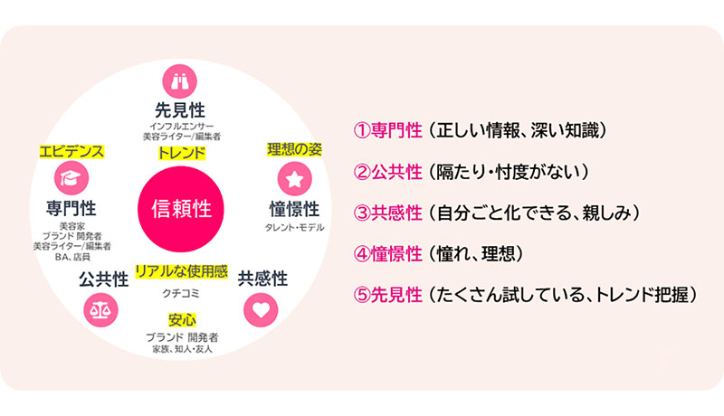 本調査では、発信者を単なる人気ではなく「専門性」「公共性」「共感性」「憧憬性」「先見性」という5つの軸で評価。商品カテゴリーや自身の悩みレベルに応じて、どの「軸」の情報を重視して裏取りを行うかが体系化されている現状を分析している。