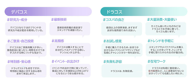 一方、ドラコスでは情報の「鮮度」と「瞬発的な共感」が検証のポイントとなっており、カテゴリーごとに購買スイッチが明確に分かれる結果となった。