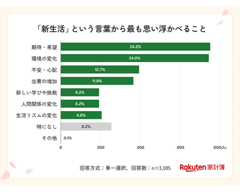 「新生活」という言葉から思い浮かべることについて聞いたところ、「期待・希望」(24.2%)が最多となり、僅差で「環境の変化」(24.0%)が続いた。一方、「不安・心配」(12.8%)や「出費の増加」(11.8%)といった、精神的・金銭的な負担を連想する回答も一定数確認された。