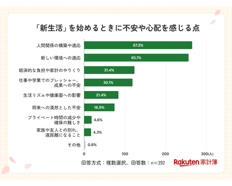 「経済的な負担や家計のやりくり」も31.4%を占め、金銭面での不安も一定数確認された。この結果について楽天は「新生活はまとまった出費が多い時期であり、金銭的な不安が高まる傾向にあると考えられます」と分析している。