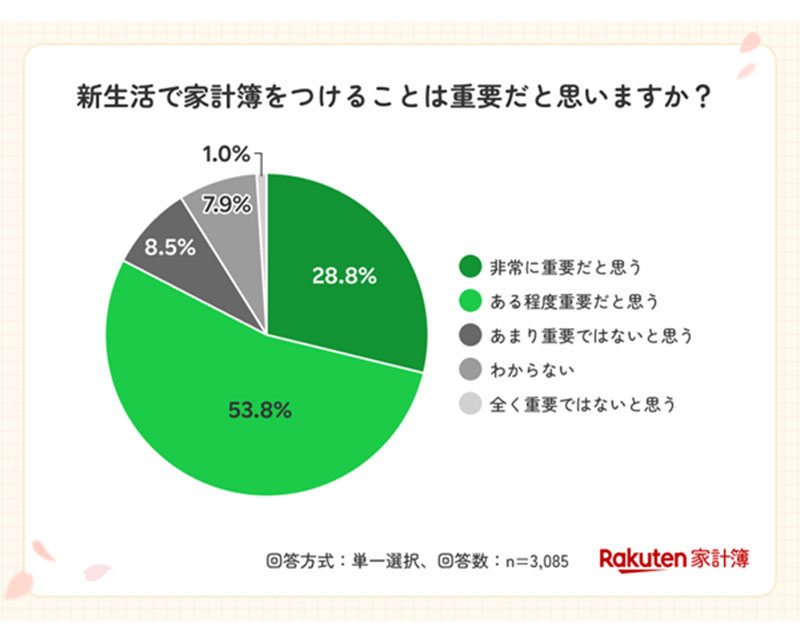 全体を対象に新生活における家計簿の重要性について聞いたところ、28.8%「非常に重要だと思う」、53.8%が「ある程度重要だと思う」と回答した。