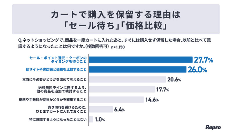 この結果についてReproは「物価高を背景に、購入を即決せず、価格や必要性を慎重に見極める購買行動が広がっていることがうかがえます」とコメントしている。