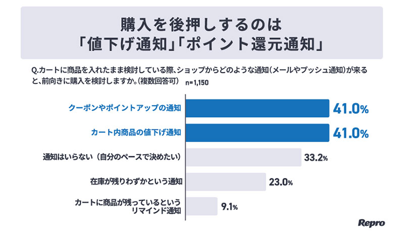 また、カートに入れた商品に関する通知について、どのような情報が購入の後押しになるかをたずねたところ、「クーポンやポイントアップの通知」と「値下げ通知」が41.0%を占めた。