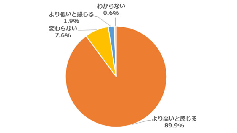 「より高いと感じる」と答えた人を年代別に見ると20代が7割台で、年代が上がるにつれて増え、70代以上では9割台半ばに達した。職業別では、教職員が7割台と、最も低い結果となった。