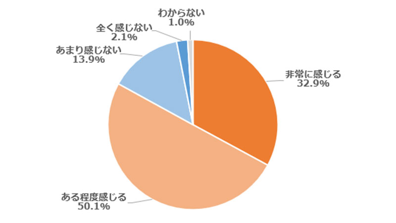 また、「物価高によって生活が困窮してきていると感じるか」の質問には、「非常に感じる」「ある程度感じる」が計83.0%に達した。それに対し「全く感じない」「あまり感じない」は計16.0%となった。