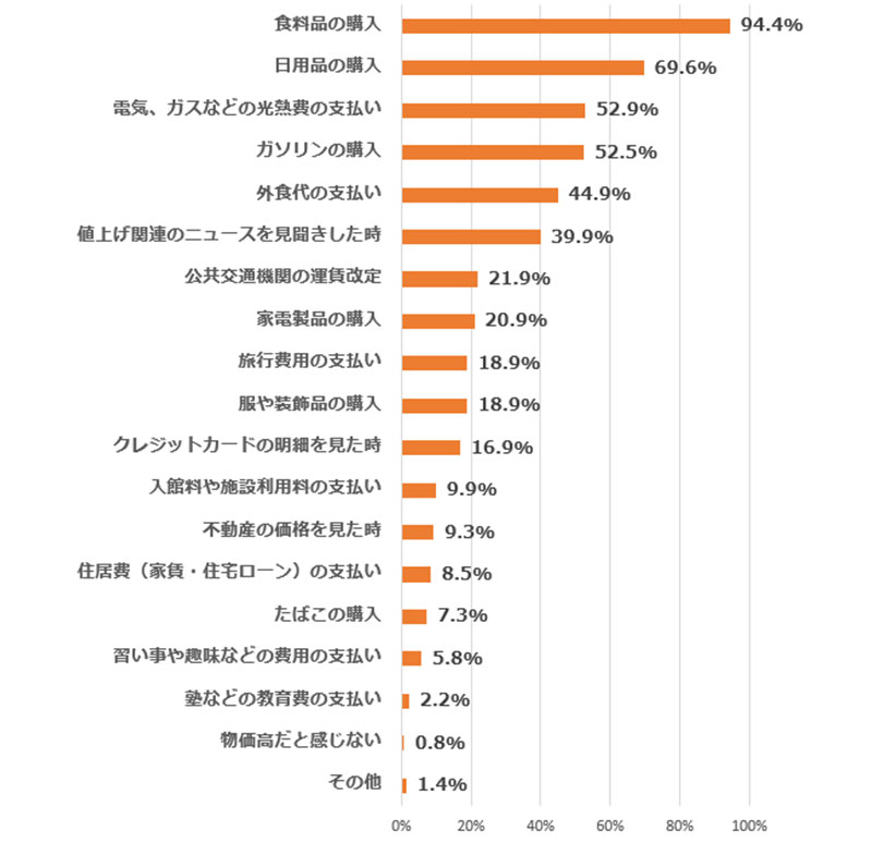 具体的に物価上昇を感じる場面(複数回答)は「食料品の購入」が94.4%(前回2025年11月26日調査93.8%)で最多に。「日用品の購入」69.6%(前回67.9%)、「電気、ガスなどの光熱費の支払い」52.9%(前回50.4%)と続いた。