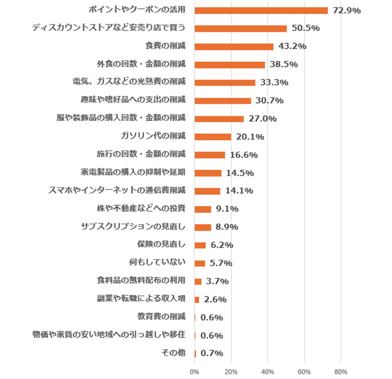 自身が物価高対策として行っていること(複数回答)を聞くと、上位3位は「ポイントやクーポンの活用」72.9%(前回2025年11月26日調査76.1%)、「ディスカウントストアなど安売り店で買う」50.5%(前回43.9%)、「食費の削減」43.2%(前回45.3%)となった。