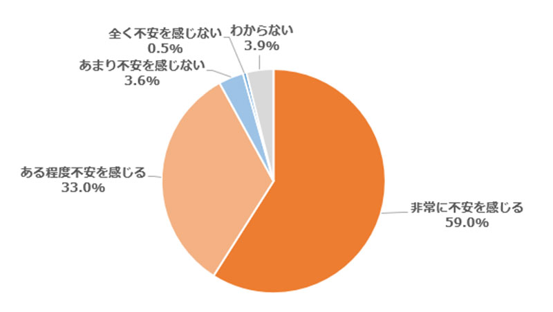 これらの影響で生活にどの程度、不安を感じるかの質問には「非常に不安を感じる」「ある程度不安を感じる」が計92.0%に達した。「全く不安を感じない」「あまり不安を感じない」は計4.1%にとどまった。
