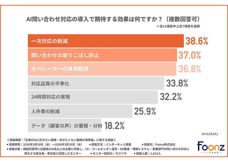 Foonzはこの結果について「上位3項目に共通しているのは、顧客との『接点(入り口)』となる定型的な業務であるという点です。顧客の用件を正しく聞き取って適切な部署へつなぐ業務や、マニュアル化しやすいよくある質問への回答は、数に追われがちで担当者の負担になりやすい領域だといえます」と分析している。