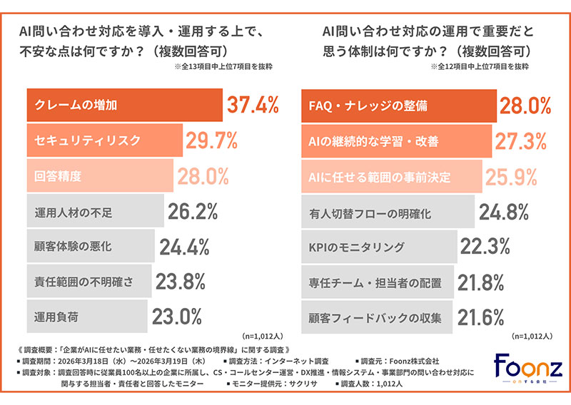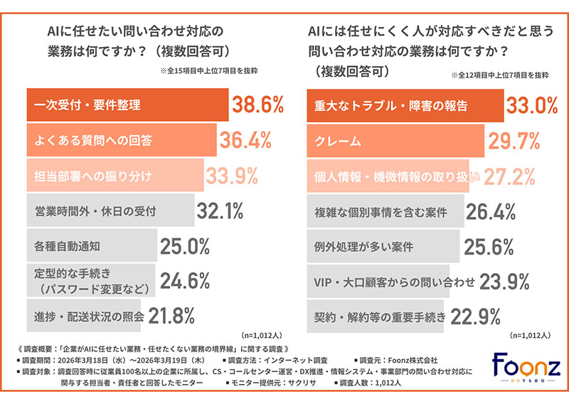 Foonz株式会社は2026年3月30日、「企業がAIに任せたい業務・任せたくない業務の境界線」に関する調査結果を発表した。