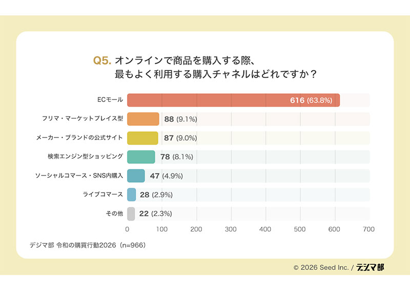 「最もよく利用する購入チャネル」ではECモールは63.8%と高水準を維持。一方、公式サイトは9.0%にとどまる。