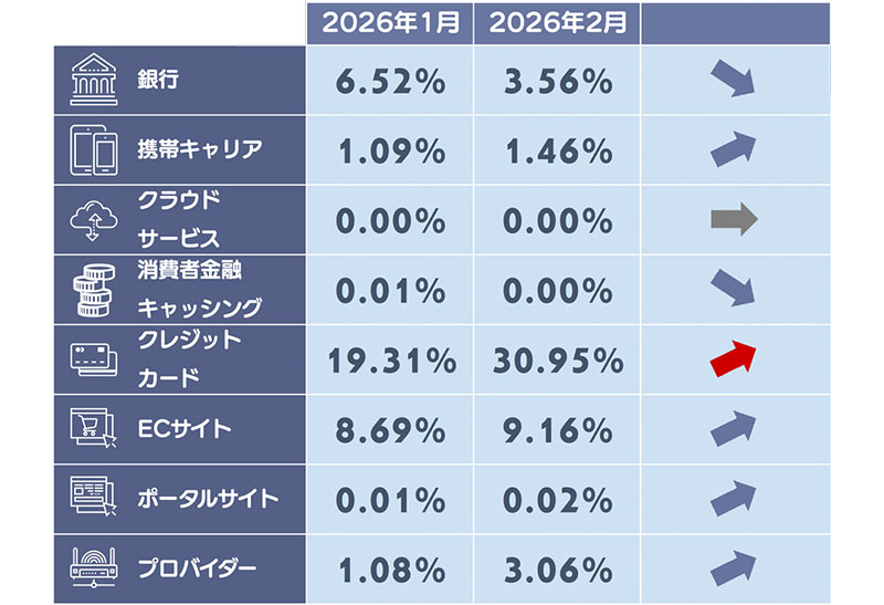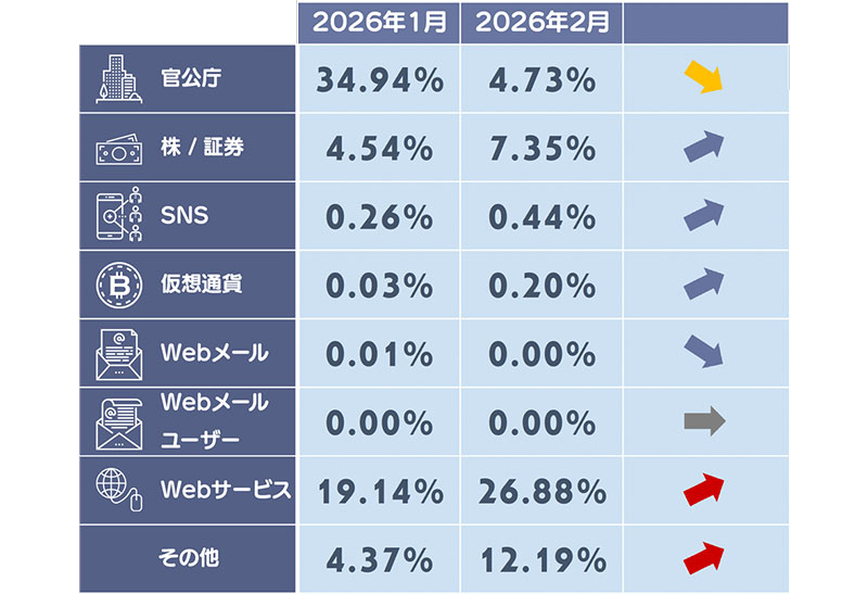 また、2月度はクレジットカードを装ったフィッシングサイトの構成比が上昇している。ただし、毎年この時期はフィッシングサイト全体の収集数が減少する傾向があり、実数ベースではすべてのカテゴリで減少している。