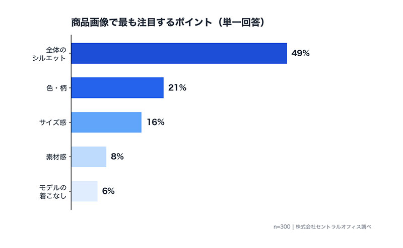 「商品画像で最も注目するポイントは?」という質問に対しては、「全体のシルエット」が49%で最も高い割合となった。