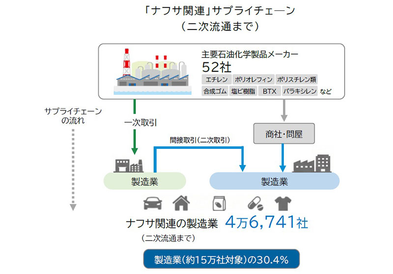 サプライチェーンの分析ではエチレンといったの基礎化学品のほか、頂点企業の取扱製品によってガソリンなどの燃料や、建築・土木用途のマテリアル素材を含むケースがあるものの、国内製造業の3割がナフサ関連製品を原材料とした産業に携わっている可能性がある。また、三次取引以降の流通や、最終製品を通じた小売現場も含めると、より広範囲の企業に影響が及ぶとみられる。
