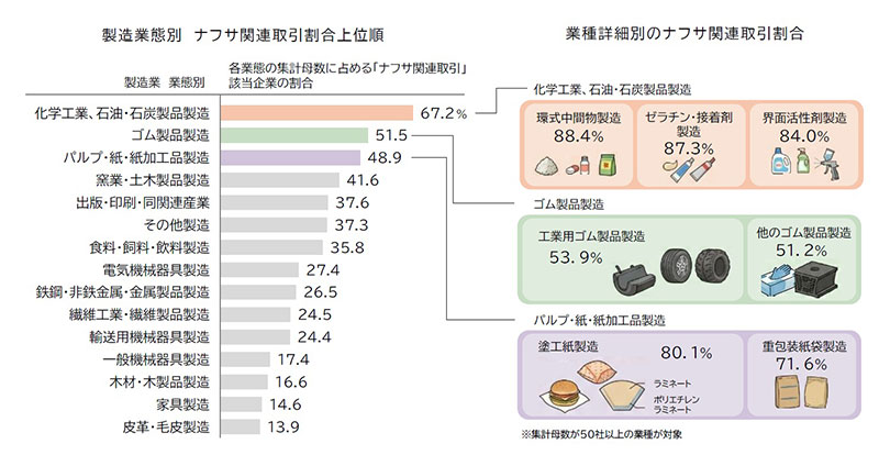 「食料・飼料・飲料製造」(35.8%)では、調味料から飲料・各種食品まで幅広く該当した。「その他製造」を含め、15の製造業態のうち7業態では、ナフサ関連取引の割合が30%を超えた。