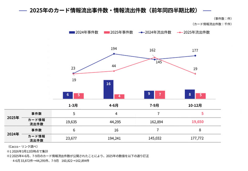 かっこ株式会社と株式会社リンクは2025年11月12日、クレジットカード情報流出事件の統計とECの不正利用傾向をまとめた四半期レポート「キャッシュレスセキュリティレポート」を公開した。本記事では最新版となる「2025年10-12月」の一部内容を抜粋して紹介する。