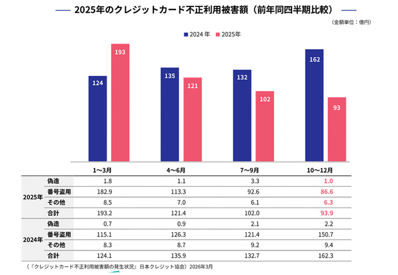 2025年10月〜12月のクレジットカード不正利用被害額は93.9億円となり、前年同期の162.3億円から減少した。