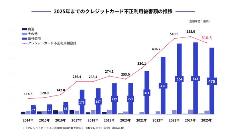 クレジットカード不正利用被害額は11年ぶりに減少に転じたが、依然として500億円を超える深刻な状況が続いている。