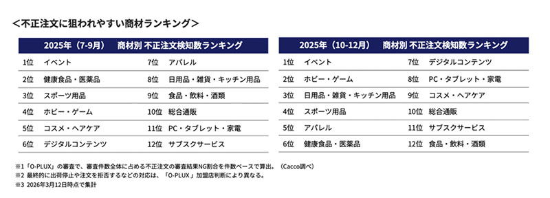 2025年10月〜12月の不正注文検知数ランキングでは、「イベント」が1位となった。