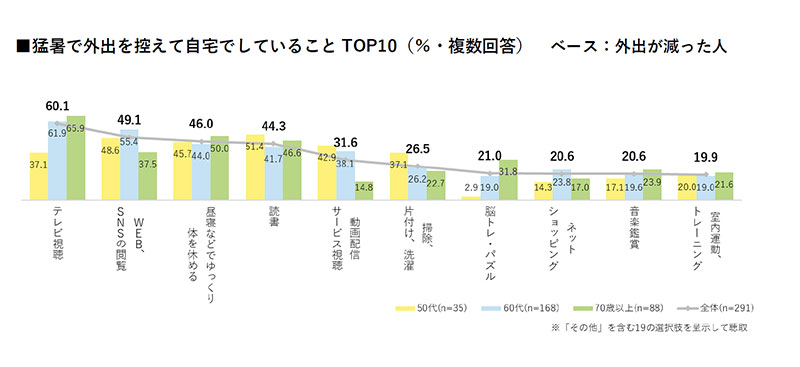 猛暑で外出を控え、自宅でしていることについては、自宅で「テレビ視聴」「Web、SNSの閲覧」「昼寝などでゆっくり体を休める」といった行動が目立った。