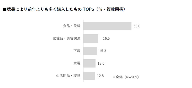 「猛暑により前年よりも多く購入したもの」については、「食品・飲料」が半数以上を占めた。
