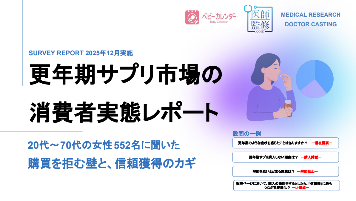 本資料は、2025年12月に実施した20代〜70代女性552名への調査をもとに、更年期サプリ市場の消費者実態を整理したレポートです。更年期のような不調を感じていても、情報収集や購入に至らない生活者が多い実態を明らかにし、購買を妨げる要因、購入のきっかけ、信頼につながる訴求要素、継続利用を促すポイントまでを多角的に分析しています。商品設計やLP改善、訴求表現の見直しに活用できる内容です。