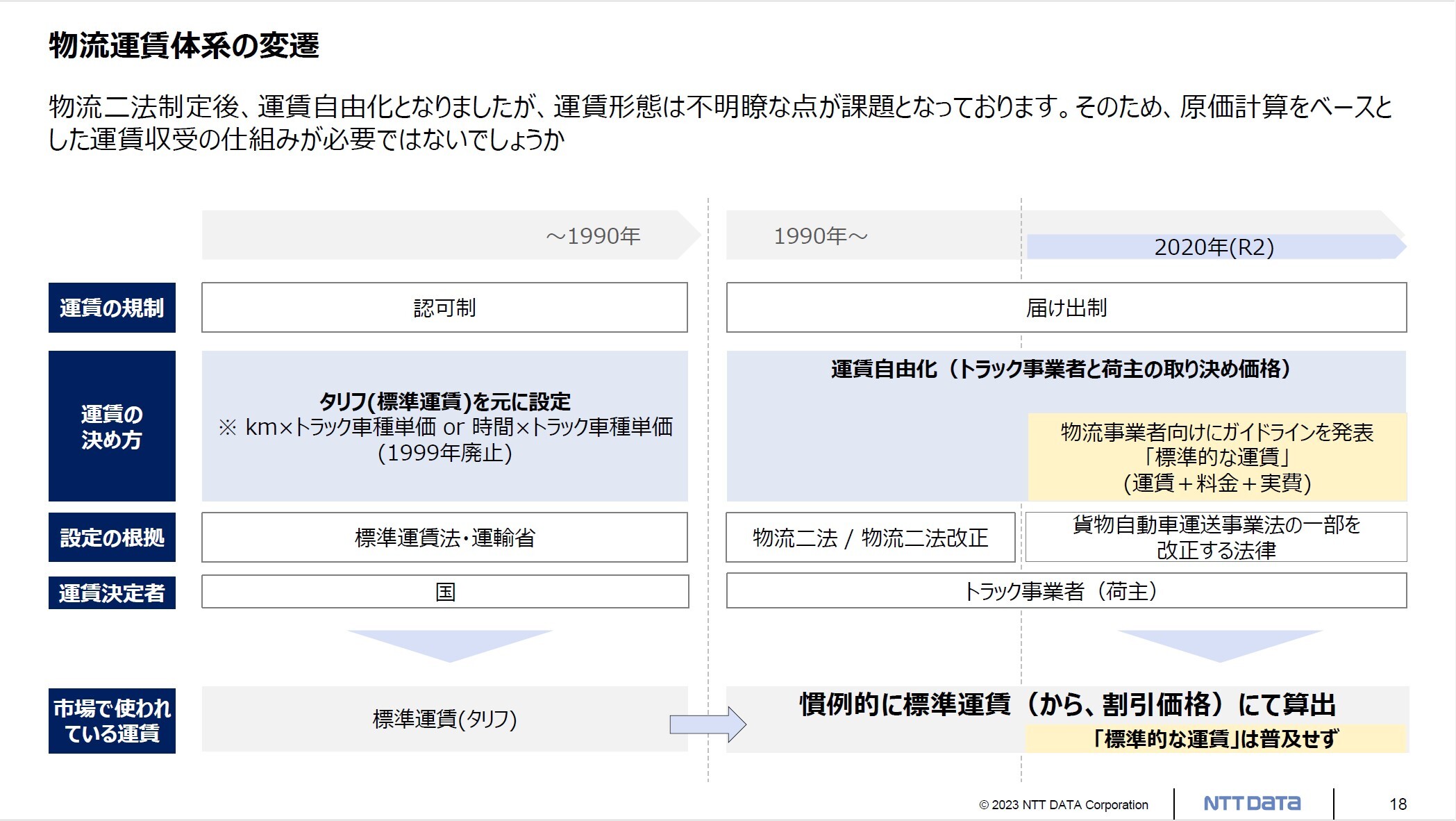 「ところがこの“運賃自由化”により運賃形態が不明瞭になり、運賃の二極化が起こり、さらに苦しい状況になってしまったのです。物流コストは売り上げの5%程度に過ぎないから、荷主にとって大きな問題になりにくいものです。でも今のままで物流が持続可能かどうか、荷主も問題点を認識する必要があります。原価計算をベースとした運賃収受の仕組みを作ることが必要といえます」(NTTデータ南田氏)