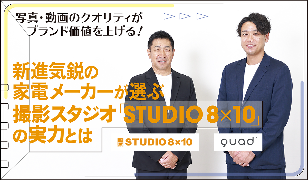 ハンズフリーで髪を乾かすスタンド型ヘアドライヤーやスタイリッシュな充電式3Dサーキュレーターなど、“新しい価値”を与えてくれるプロダクトを世に送り出してきた株式会社QUADS(クワッズ)。基本を大切にしながらも機能・デザイン性を追求したオリジナル家電は、国内外に数多くファンがいる。そんな新進気鋭の家電メーカーのブランディングをビジュアル面で支えるのが、東京・渋谷区に自社スタジオ「STUDIO8×10(エイト・バイ・テン)」を構える株式会社エイト・バイ・テンだ。同社の池畑直樹代表とQUADSの長谷川智士氏に、ECビジネスにおける写真の重要性やイメージ通りの写真を撮ってもらうためのコツなどを聞いた。