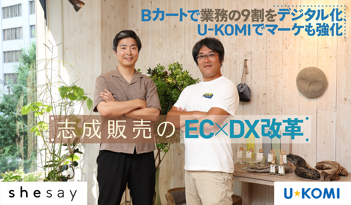 インテリア・生活雑貨・服飾小物などの輸入卸売販売を行う株式会社志成販売は、今から約10年前の2014年にBtoB向けの自社ECサイト「shesay」をBカートで構築した。これを機に進んだ社内のDXは同社の業績を押し上げ、業務効率化や生産性向上を実現。2022年には「U-KOMI」の導入でUGC(ユーザー生成コンテンツ)活用に乗り出すなど、デジタル領域での業務を強化してきた。志成販売の戦正典社長とU-KOMIを提供する株式会社サブスパイアの岡村芳広氏に、卸売販売業者がBtoB ECに取り組むメリットやDXの成果・効果、今後の展望などについて話を聞いた。