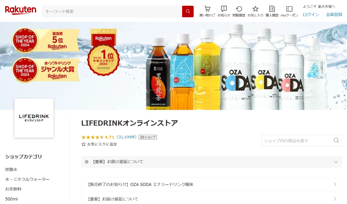 同社の最大の強みは、年間約4700万ケースのペットボトル飲料を製造販売しているというスケールメリットによる価格の安さだ。加糖飲料などと違い、無糖炭酸水のように味に大きな差がない商品では、価格の訴求力が強みになる。LIFEDRINKオンラインストア 楽天市場店の人気商品であるOZA SODA 500ml×24本は、送料無料で通常価格1429円~(2025年8月時点)。48本入のまとめ買いなら1本あたりの価格がさらに安くなるという。