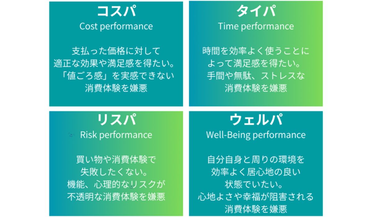 「顧客の離脱を未然に防ぐためにコスパとタイパへの対策の遅れは、顧客離脱に致命的な影響を及ぼします。加えて、昨今はリスパ(失敗したくない)を重視する若い消費者が増えています。また未来の社会の良い状態を志向する企業を応援したいというモチベーションからウェルパ(心身の充足)が好まれる傾向が強くなっていることに留意すべきでしょう」(以上、発言部分は宮下教授)