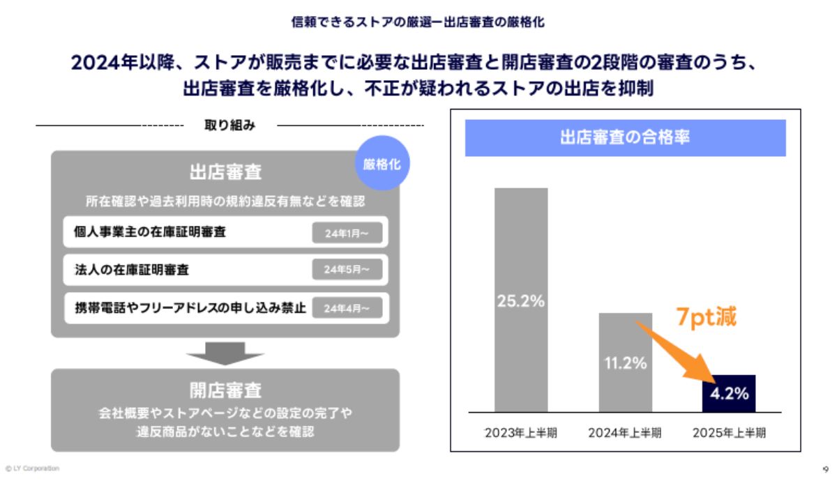 「Yahoo!ショッピング」は2024年から出店審査の厳格化を進めている。出店審査の合格率は2023年上半期の25.2%から2024年上半期11.2%、2025年上半期4.2%と下降した。この出店審査に合格したストアのみが、適正なストアを準備できていることを確認する開店審査に進める。